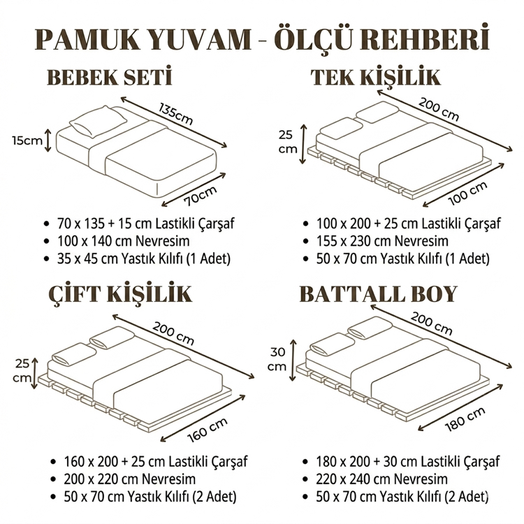 Pamuklu nevresim takımları, lastikli çarşaflar ve yatak odanıza şıklık katan desenler burada. Kaliteli kumaş, özenli dikiş ve IBAN / havale, kapıda nakit, kapıda kredi kartı seçenekleriyle kolay sipariş deneyimi sunuyoruz.